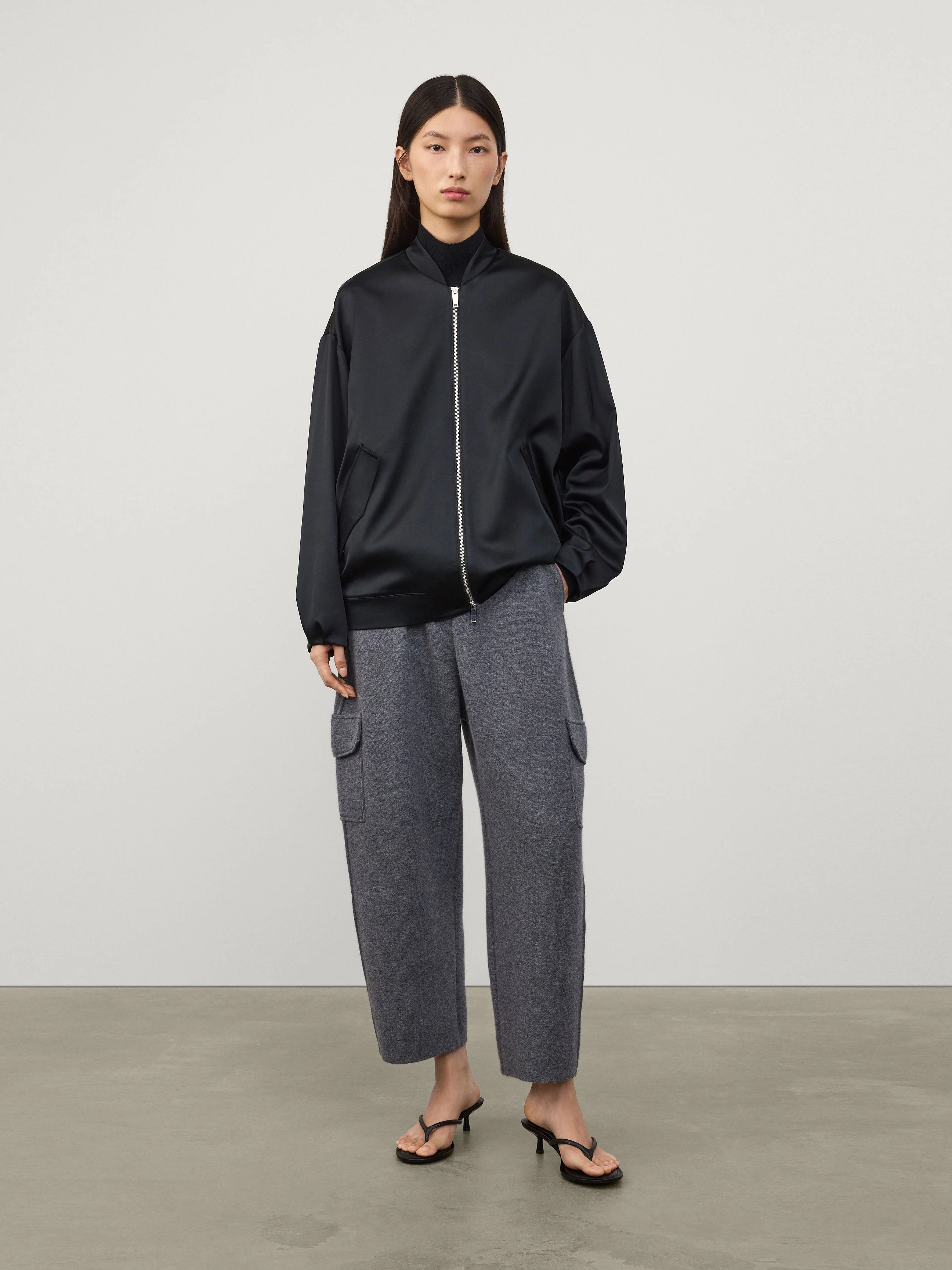 A sporty articulation of satin, the Bomber jacket is crafted in a shiny woven satin fabric for a sleek look. The relaxed fit, utility-inspired silhouette is detailed with dropped shoulders, full-length sleeves, slit pockets and a double zip fastening.