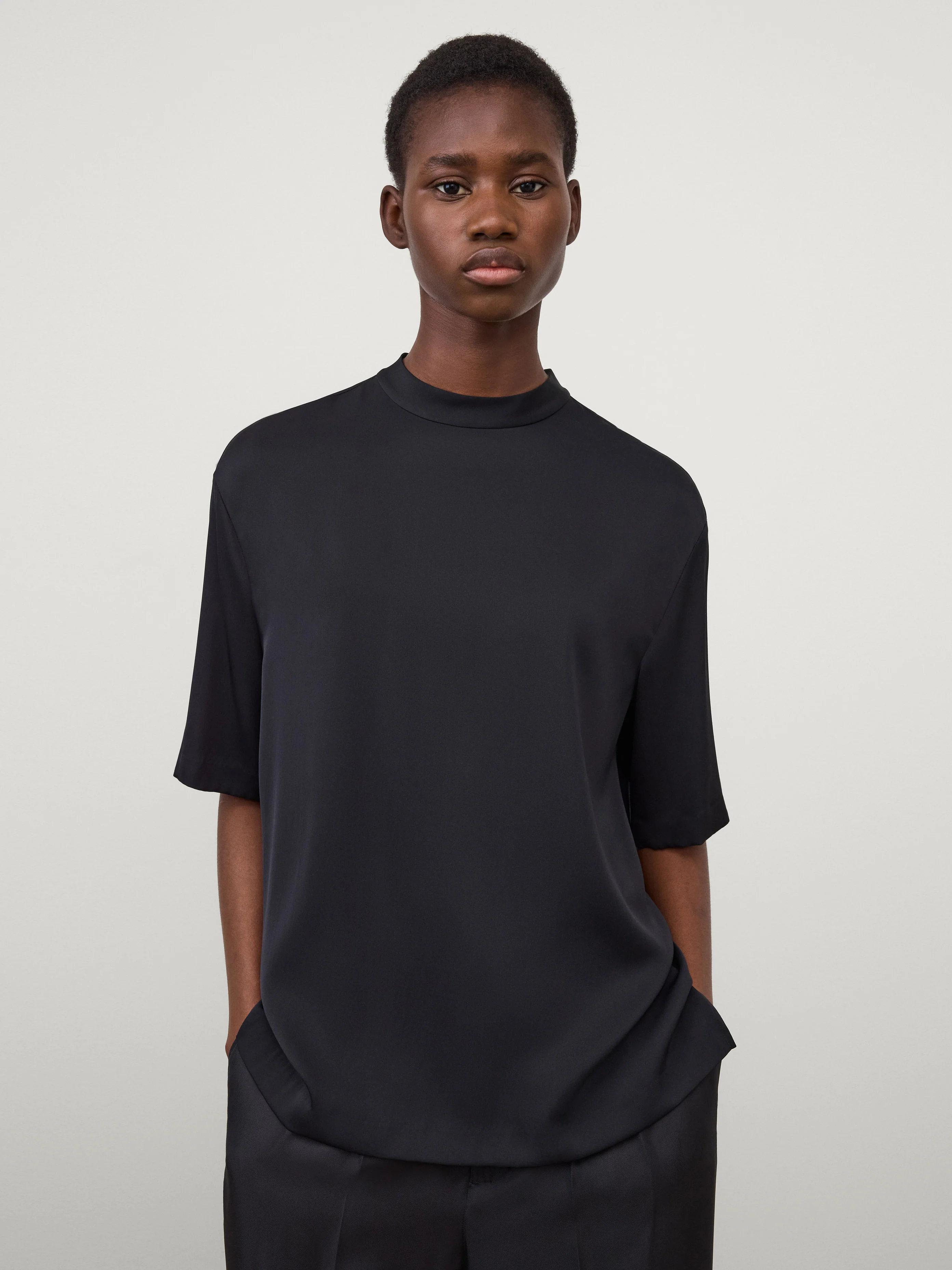 A sporty articulation of silk, the oversized round neck t-shirt is crafted in double georgette silk with a touch of spandex for added stretch. The relaxed fit, hip-length silhouette features a crew neck, a bias-cut neck trim, dropped shoulders, short sleeves, a clean hem and a concealed zip fastening.