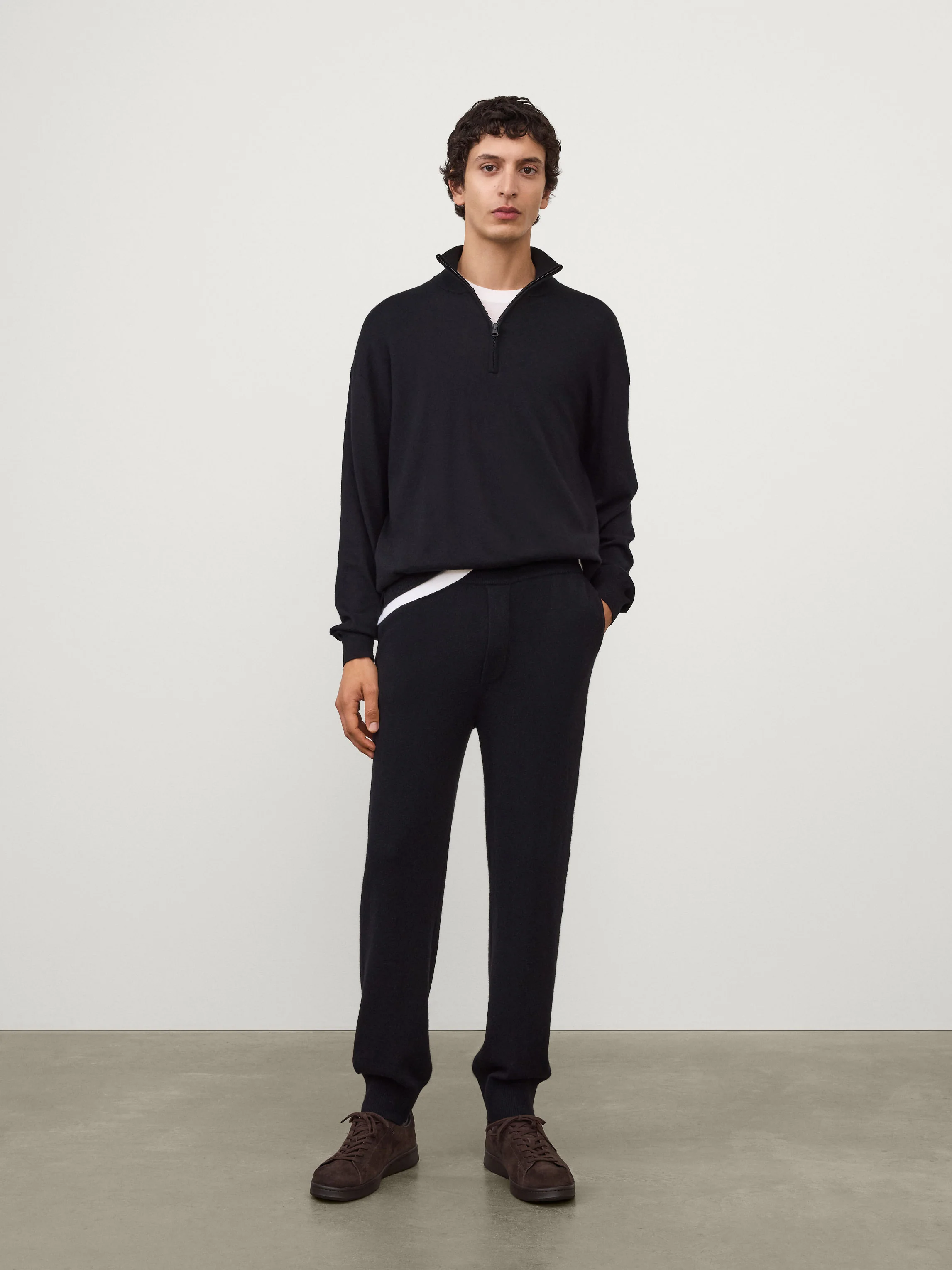 A sporty, casual silhouette, the Beaumont trousers are knitted in our signature mid-weight cashmere for transeasonal wear. The regular fit silhouette features an elasticated waistband with a hidden drawstring, a mock fly, side pockets, a back yoke detail, full-length legs and ribbed trims.
