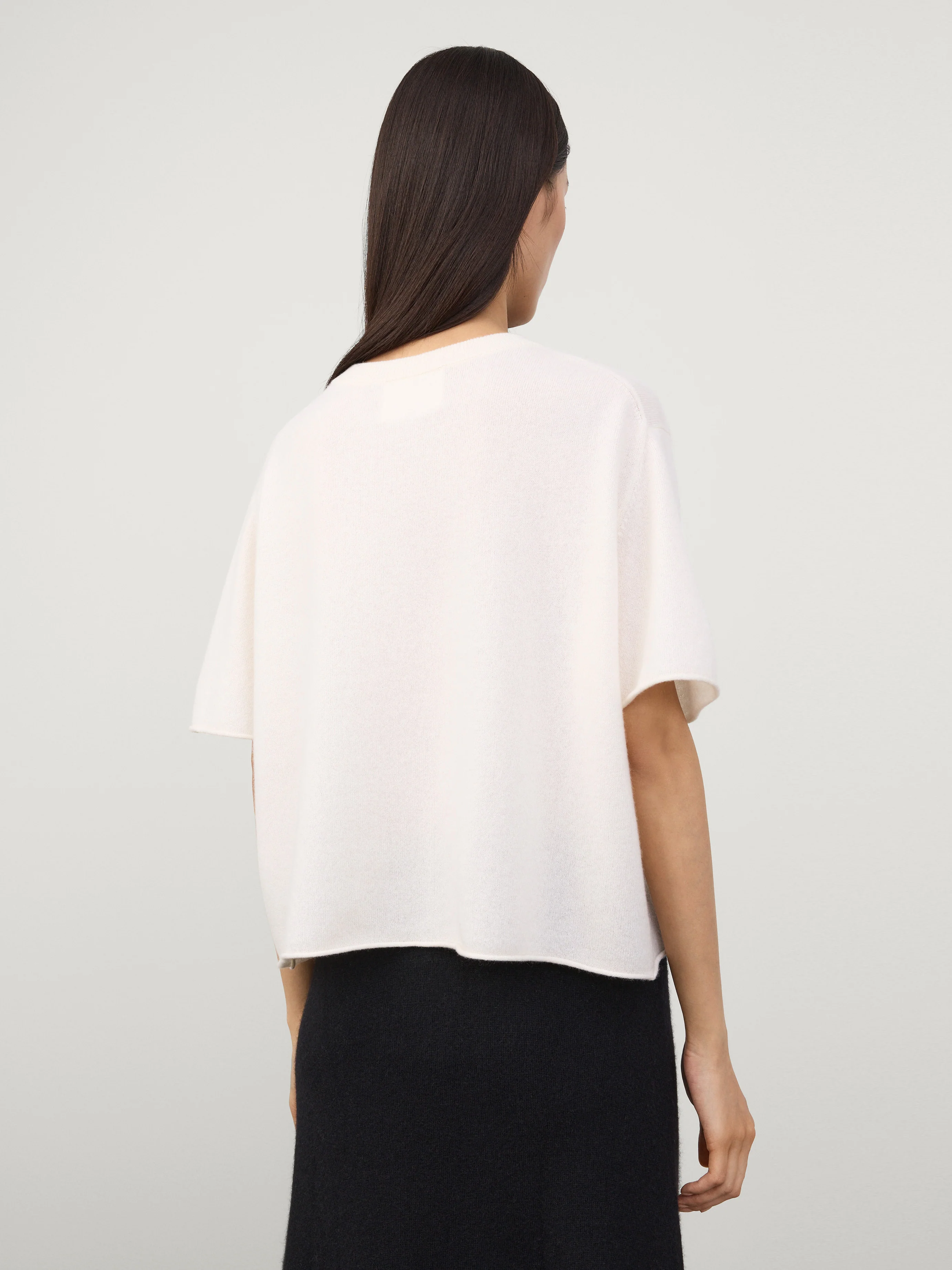 An everyday layering piece, the Cila T-shirt is crafted in soft, mid-weight cashmere for year-round wear. The slightly wide and cropped silhouette is framed by a crew neck, dropped shoulders and short sleeves, with a rolled hemline which crops at the hip.