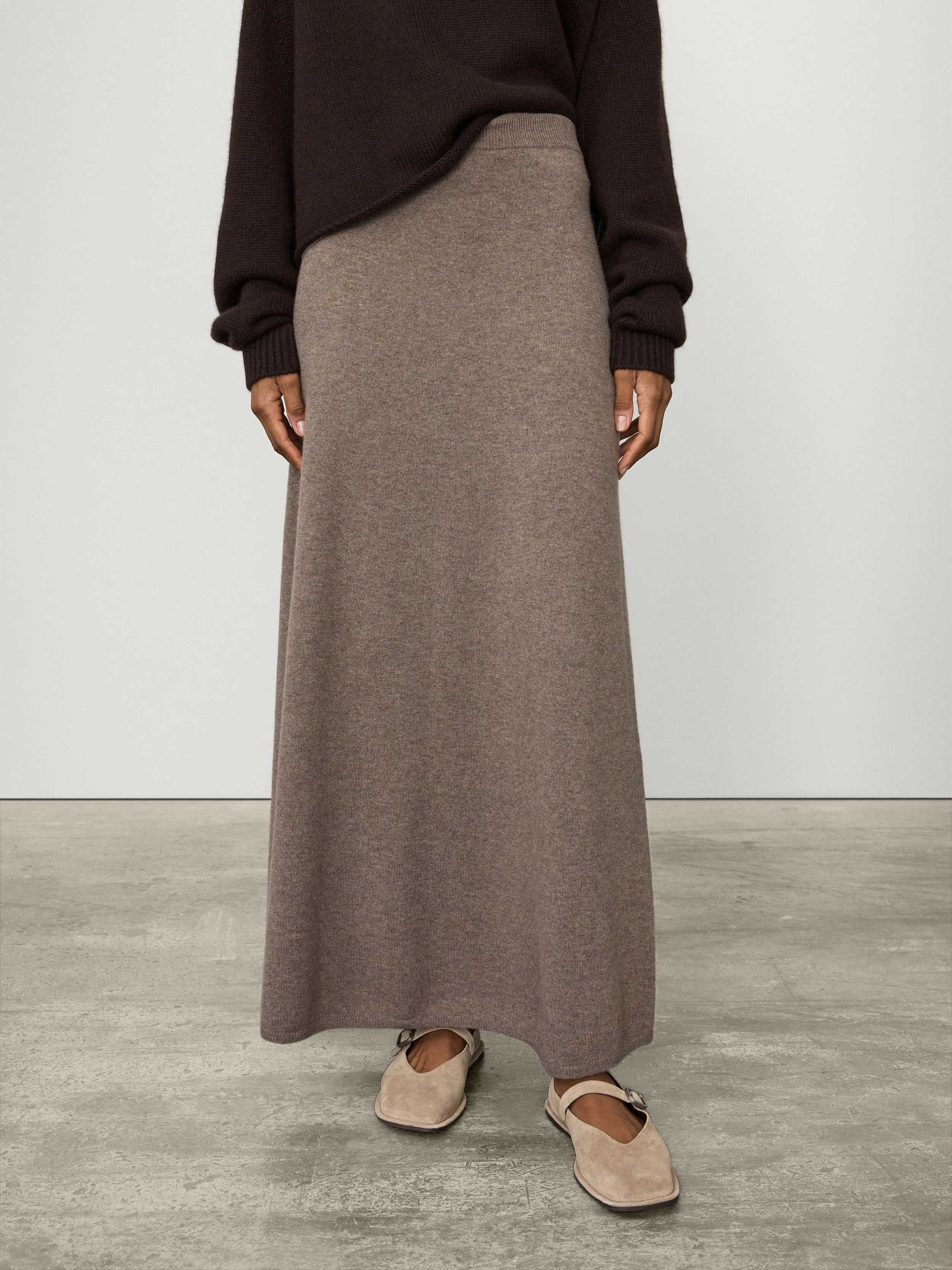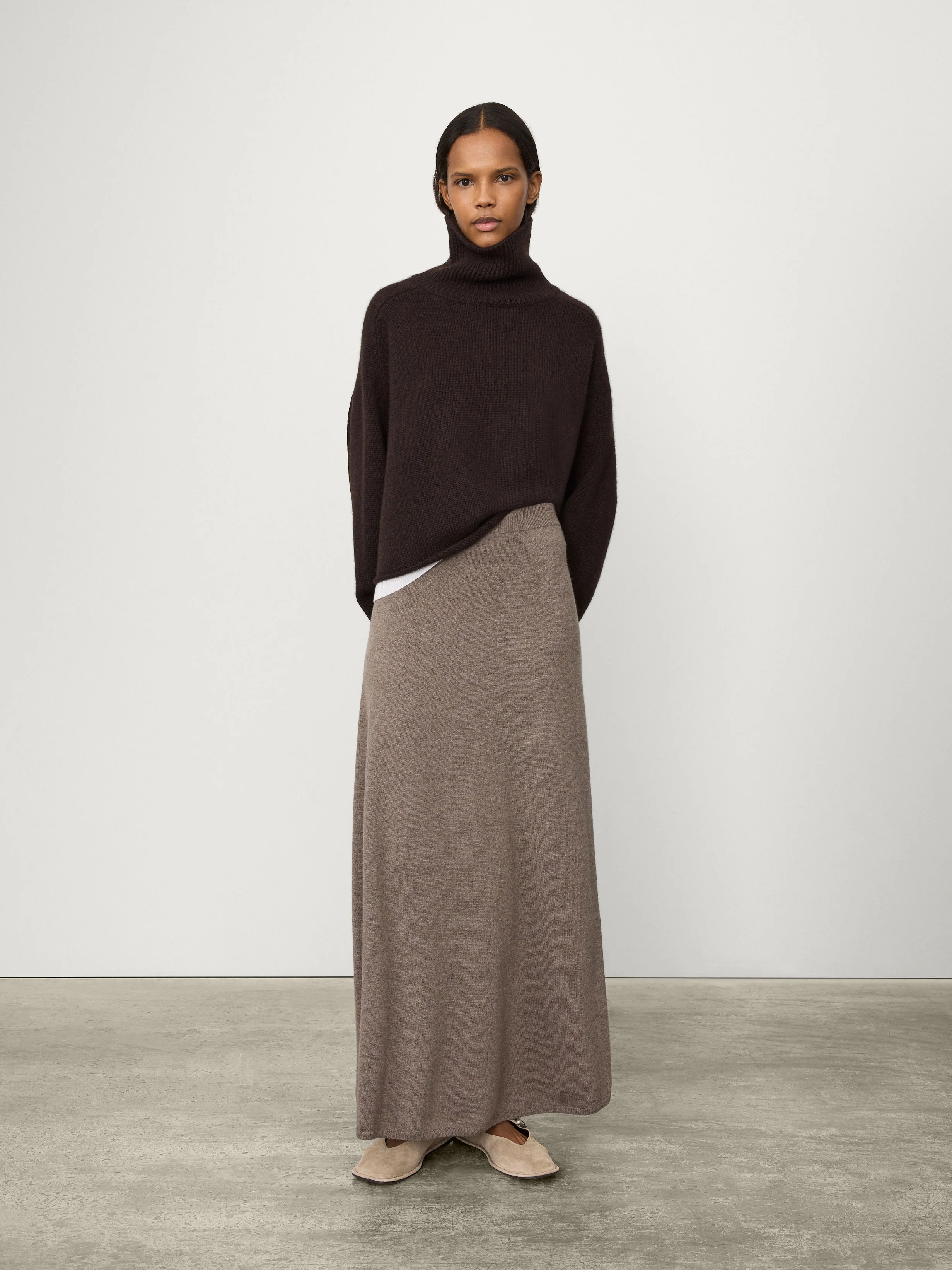 A maxi skirt with generous proportions, the Dolly skirt is crafted in soft, mid-weight cashmere for transeasonal wear. The relaxed, seamless design sits comfortably at the waist with an elasticated waistband, and falls into a graceful A-line silhouette. A two-in-one design, Dolly can also be worn as a sleeveless bandeau dress.