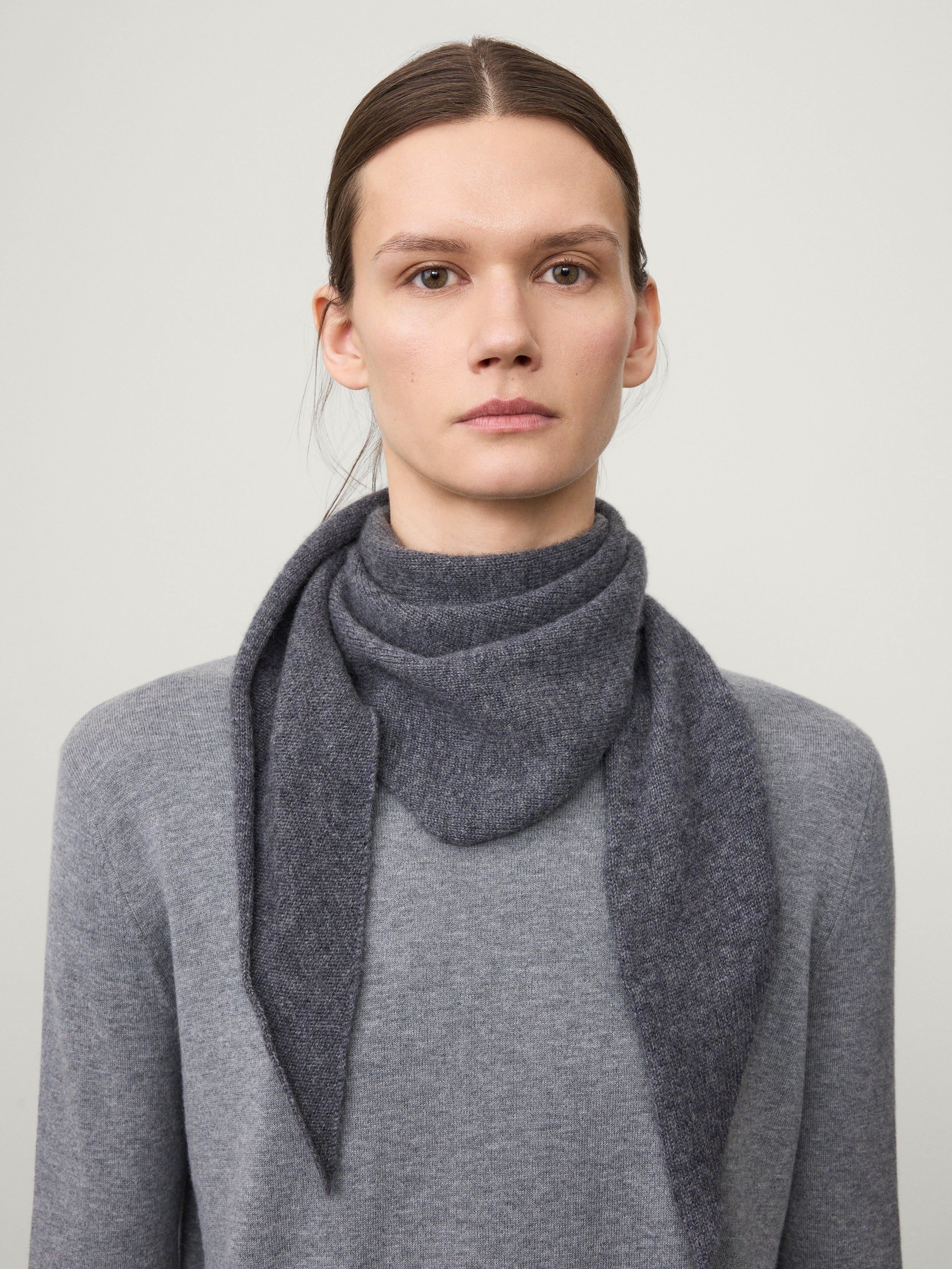 A new bandana, the Florianne scarf is crafted in our signature plain knit, mid-weight cashmere with a soft and smooth hand feel. The triangular silhouette can be worn as a headscarf or a neck scarf, framing the face in a gentle drape.