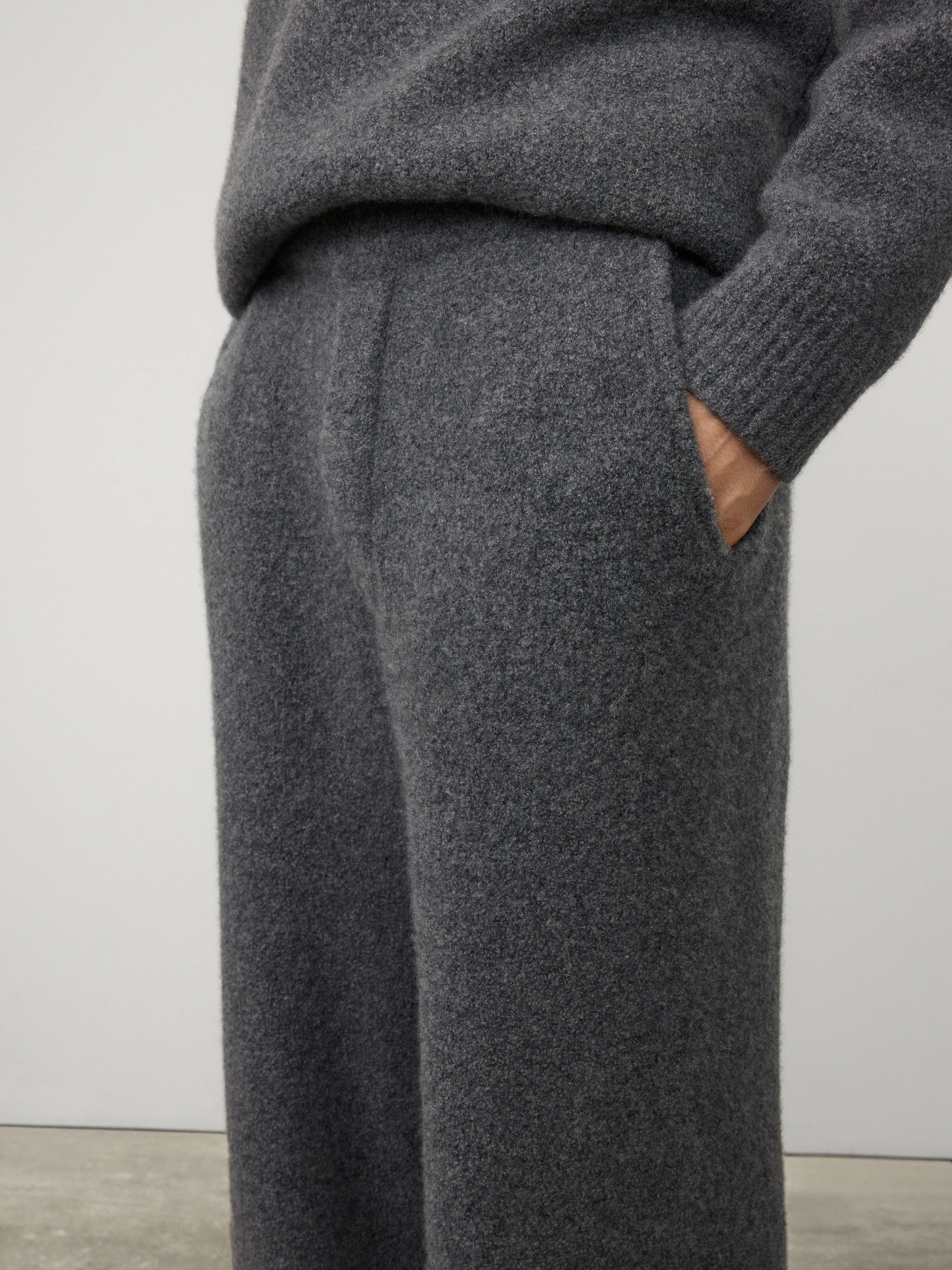 In our bouclé cashmere, the Jayden trouser features a relaxed fit, elasticated waistband and full-length leg. Paired here with the tonal Zion sweater.