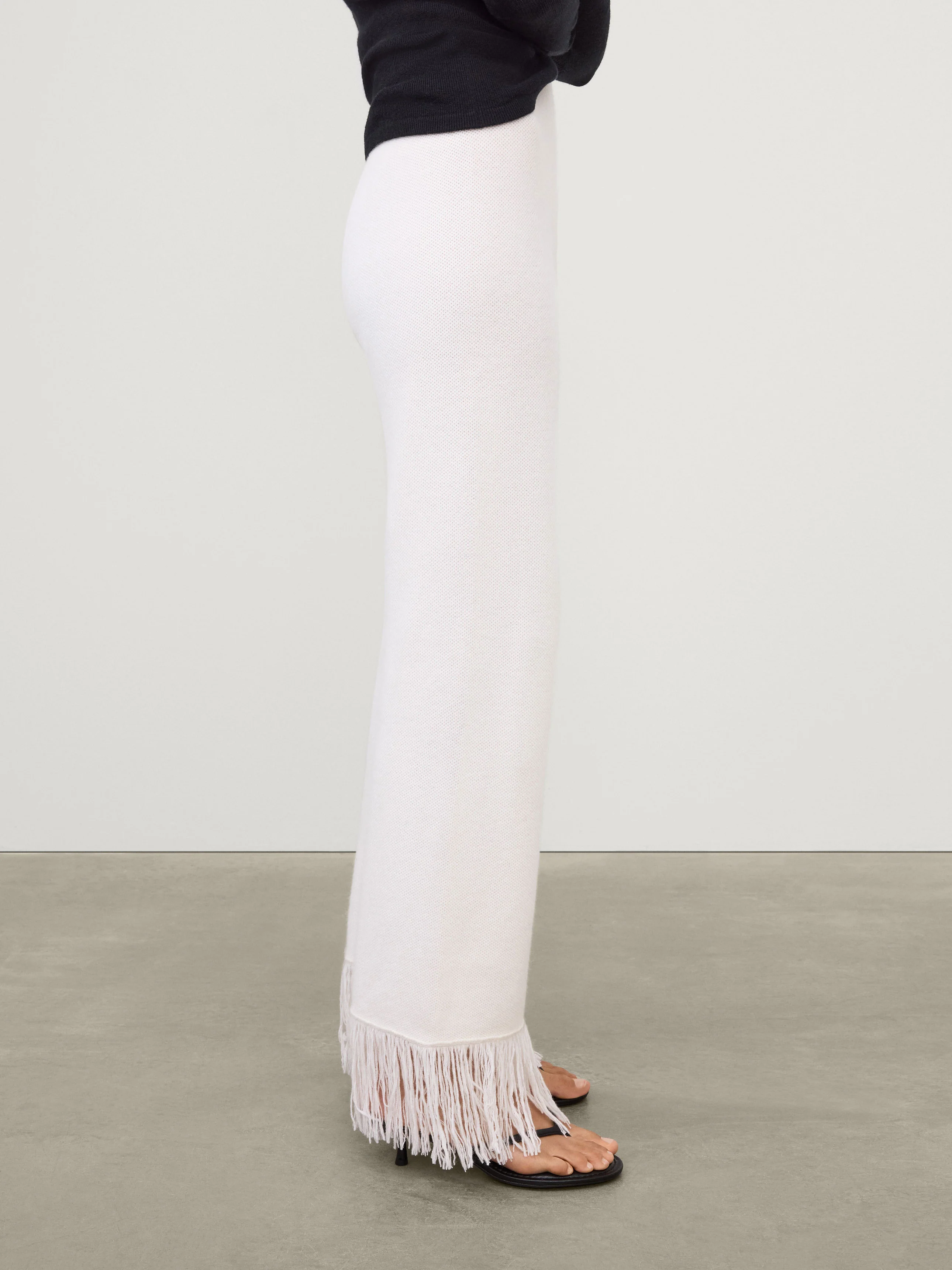 A new trouser silhouette, the Kiera trouser is crafted in softly textured honeycomb knit cashmere. The straight, wide leg silhouette sits comfortably at the waist and is detailed with fringes at the hem which length can be adjusted by cutting.