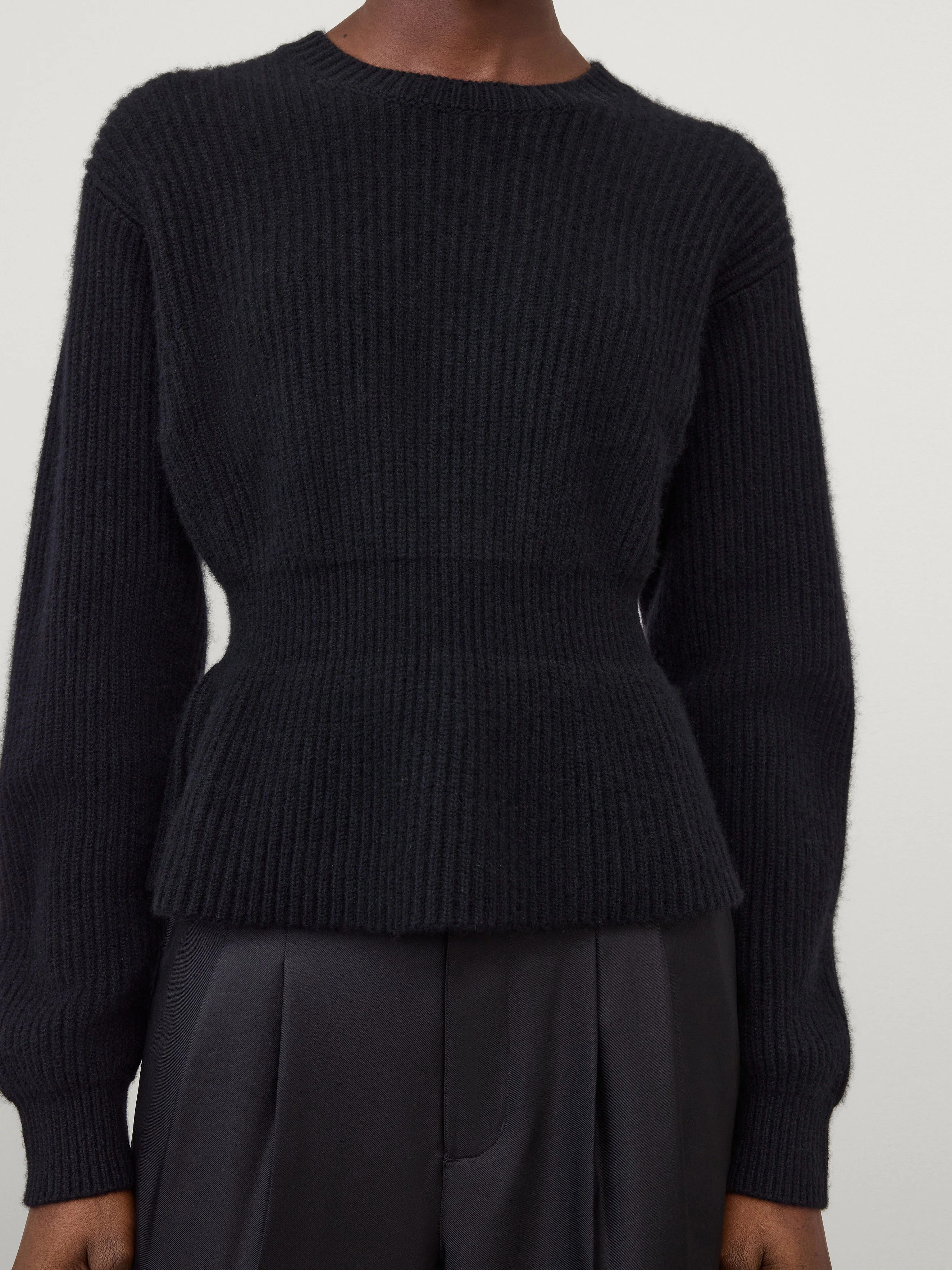 A sculpting peplum silhouette, the Miriella sweater is crafted in heavy knit cashmere with a chunky ribbed texture. The regular fit, feminine silhouette is cinched at the waist and features a round neck, full-length sleeves, ribbed trims and a peplum hem.