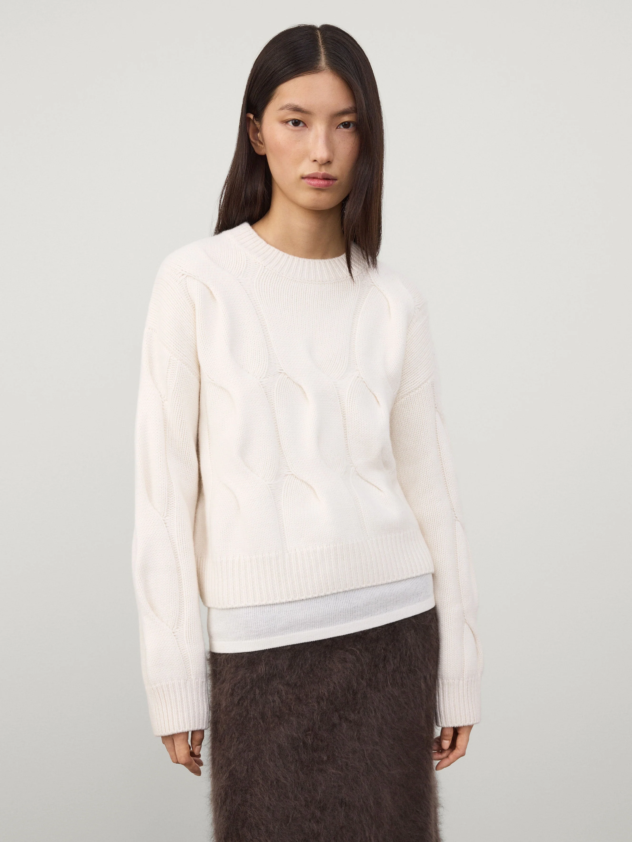 A piece with sculpted textures, the Sammie sweater is crafted in heavy knit cashmere with cables in scaled-up proportions. The relaxed fit silhouette features a crew neck, dropped shoulders, full-length sleeves and ribbed trims throughout.