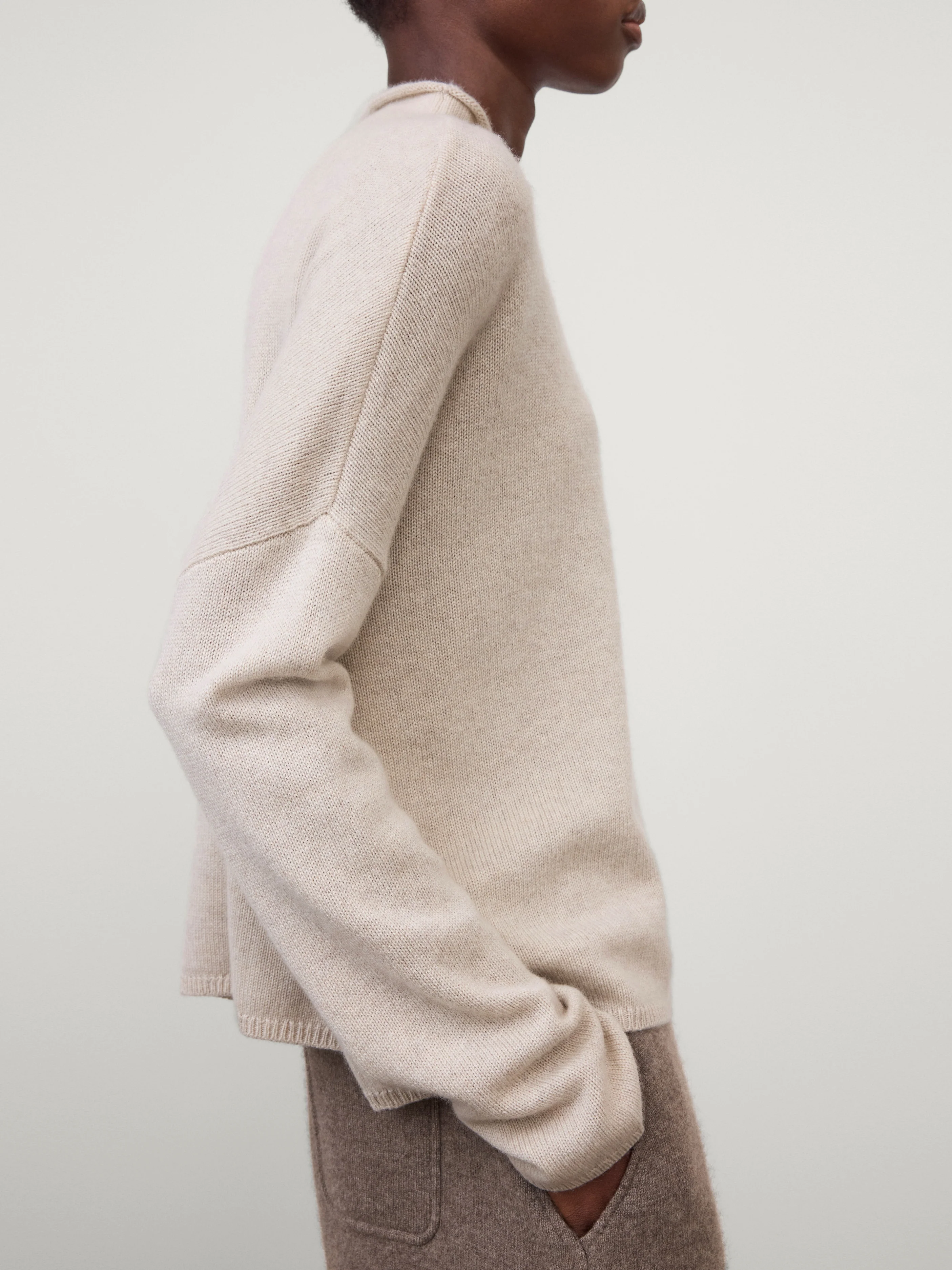 A plush top layer, the Sandy sweater is crafted in rich, heavy knit cashmere to wide proportions. The enveloping silhouette creates effortless drapes at the front and back, made sublime by the generous rolled mock neck and relaxed dropped shoulders.