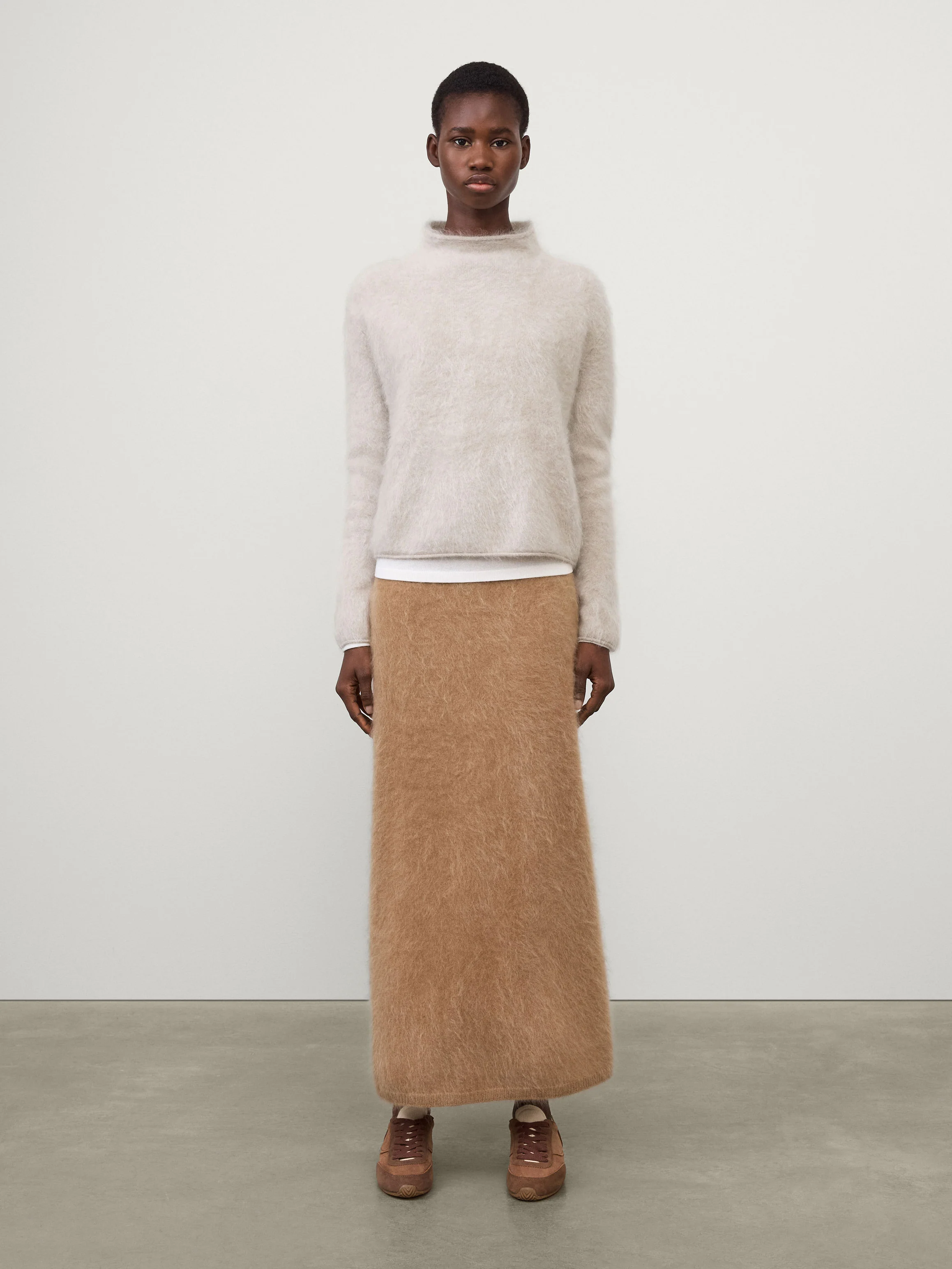 A signature silhouette, the Sandy sweater is reworked in comforting, cloud-like brushed cashmere. The regular fit, wide silhouette creates a natural drape at the front and back and features a rolled mock neck, dropped shoulders, full-length sleeves and a clean hem.